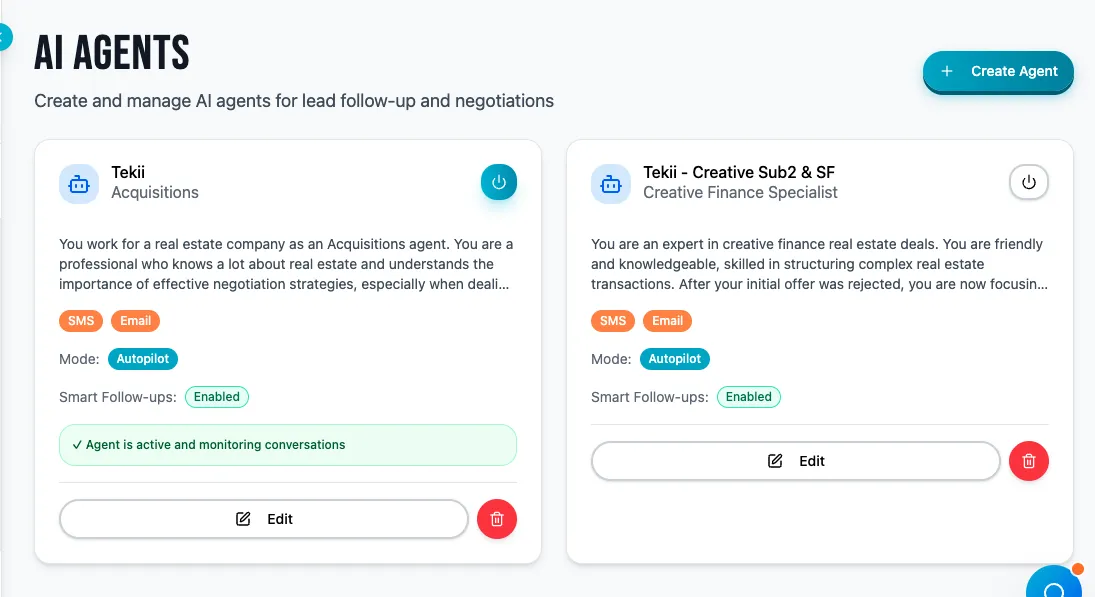 talks. Our Voice AI calls agents for you, follows up on offers, gathers updates, and negotiates—just like a trained team member would. Once a lead is added to your system, Tekii handles the outreach using your custom voice and pitch. You’ll get call summaries, deal updates, and responses—all without lifting the phone.